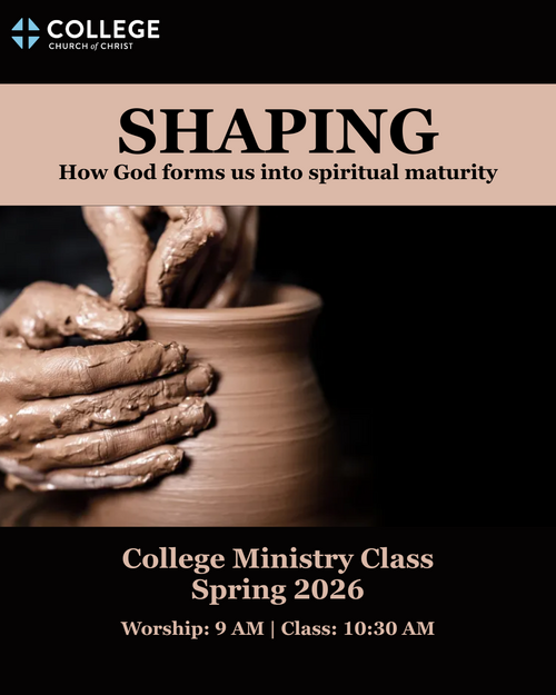 Our class meets at 10:30 in the heart of our building. Our college class is where we lay the foundation for a culture of disciple making, and we would love to see you! This semester, we are studying how God forms us into spiritual maturity and how we can open ourselves to His work in us (spring 2026).